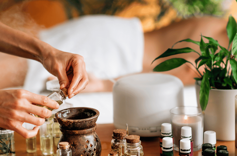 Aromatherapy is a specific type of therapy that incorporates the use of scented essential oils into a massage. The massage involves alternating between gentle and harder pressure while using a specific blend of essential oils. The essential oils are diluted before use and are applied along with lotion during the massage. Not only is the client's body benefiting with the direct contact with the essential oils, but the oils are alleged to have specific healing properties upon inhaling after exposure. Sometimes, therapists even go as far as having clients inhale the oils through a diffuser and not only through mild exposure.